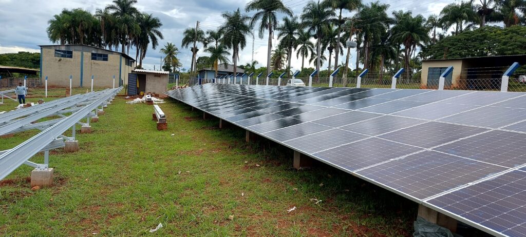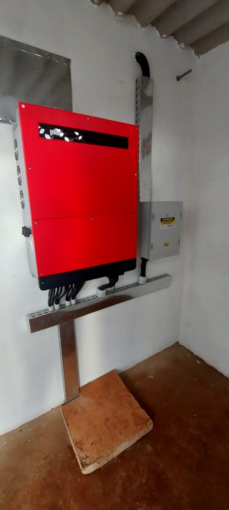 Projeto com 100,44 kWp, produção estimada de 11.904 kWh/mês. 186 módulos de 540 Wp, inversor PHB de 75kW