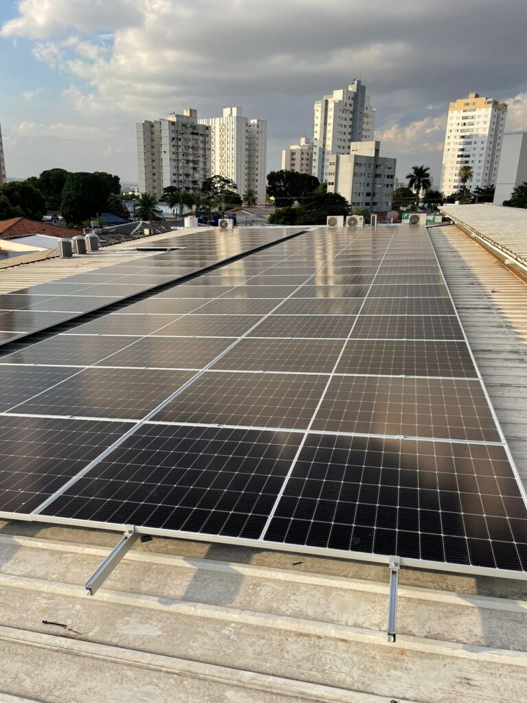 Projeto com 68 módulos de 545 Wp totalizando 37,06 kWp e produção estimada de 4.420 KWh/mês. Inversor PHB de 36 kW